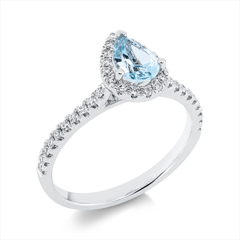 Ring 18 kt WG, 36 Brill. 0,26 ct, TW-si, 1 Aquamarin 0,56 ct blau