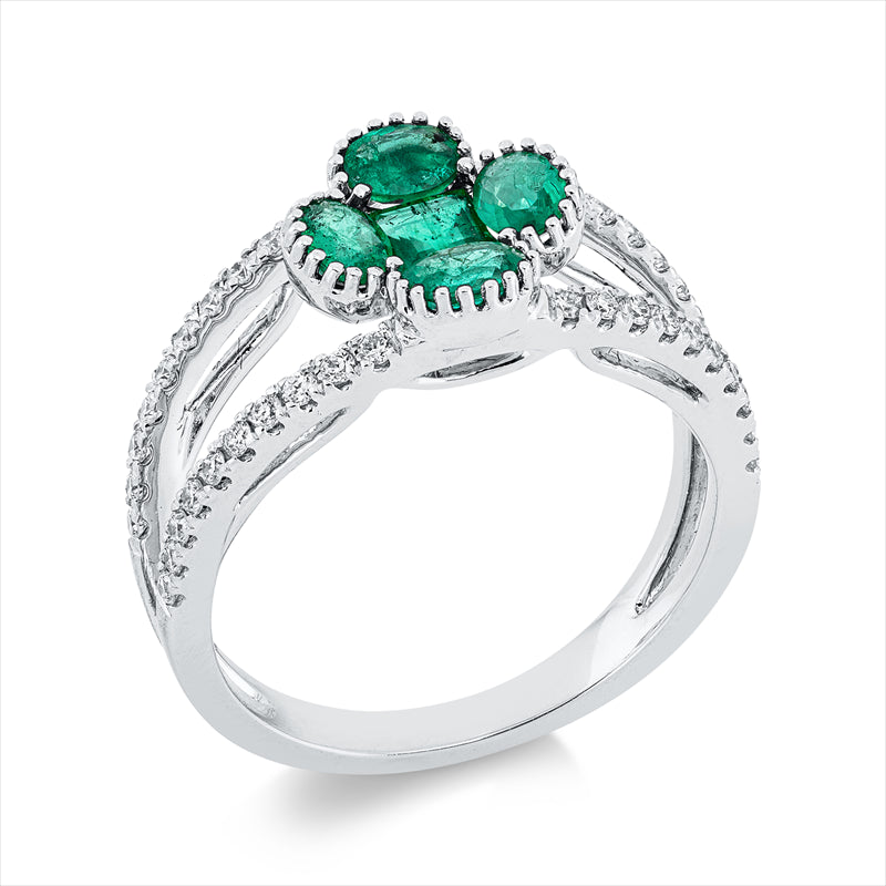 Ring 18 kt WG, 40 Brill. 0,27 ct, TW-si, 1 Smaragd 0,19 ct grün, 4 Smaragde 0,55 ct grün