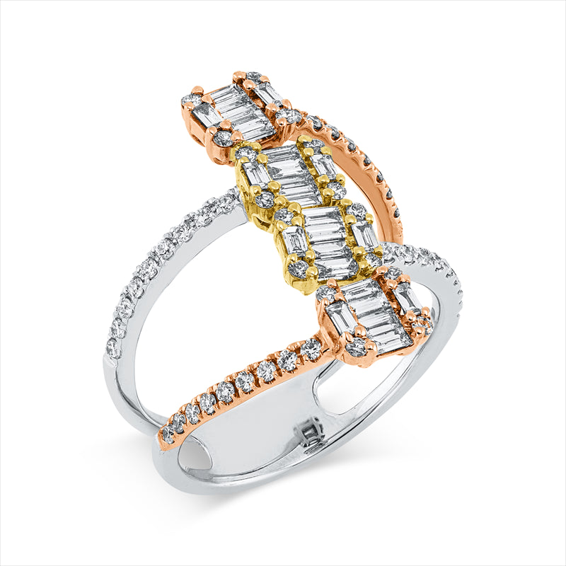 Ring 18 kt WG+GG+RG. 24 Baguette 0.44 ct. TW-vsi/si. 52 Brillanten 0.37 ct. TW-vsi/si. H:21.1 mm. B:5.8 mm. Weite:53