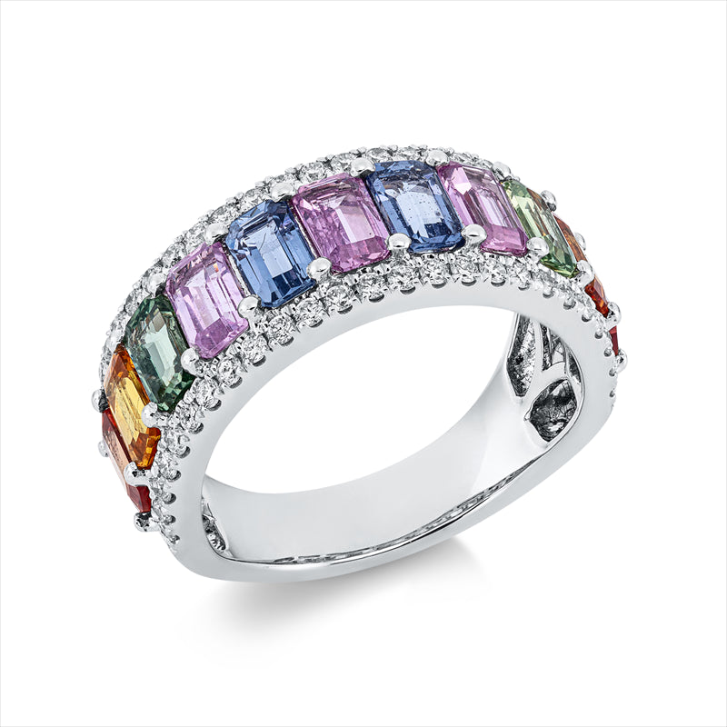 Ring 18 kt WG, 50 Brill. 0,44 ct, TW-si, 11 Saphire 3,99 ct multicolor