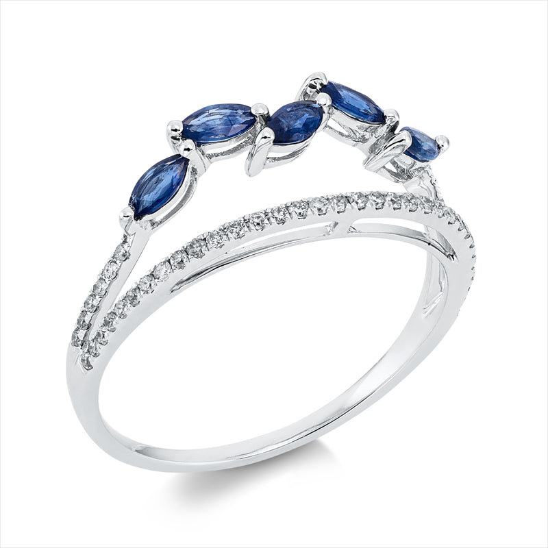 Ring 18 kt WG, 45 Brill. 0,17 ct, TW-pi, 5 Saphire 0,40 ct blau