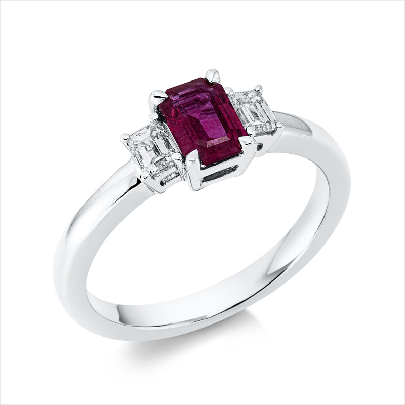 Ring 18 kt WG, 2 Sm.schliff 0,33 ct, TW-vsi, 1 Rubin 0,80 ct rot