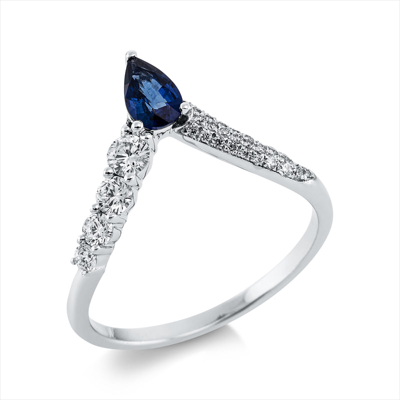 Ring 18 kt WG. 29 Brillanten 0.32 ct. TW-si. 1 Saphir 0.46 ct blau. Weite:53