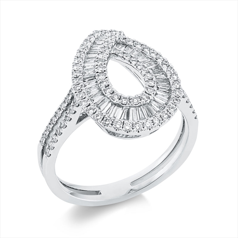 Ring 18 kt WG, 22 Trap. 0,30 ct, F-vsi, 10 Bag. 0,09 ct, F-vsi, 88 Brill. 0,47 ct, F-si