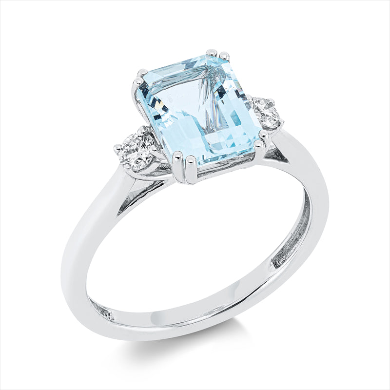 Ring 18 kt WG. 2 Brillanten 0.19 ct. W-vsi. 1 Aquamarin 2.34 ct blau. Weite:54