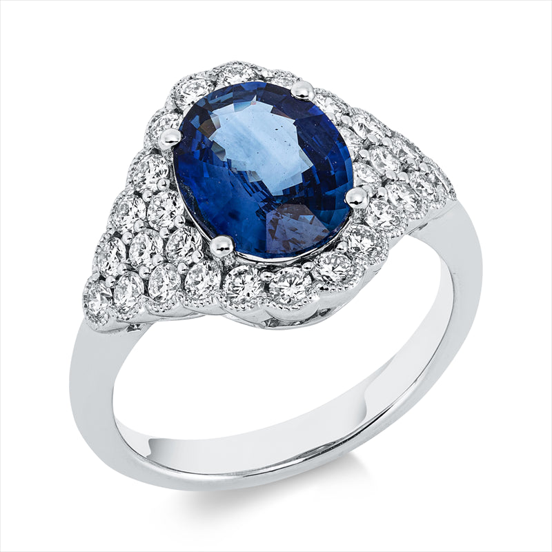 Ring 18 kt WG, 28 Brill. 0,80 ct, TW-si, 1 Saphir 2,66 ct blau