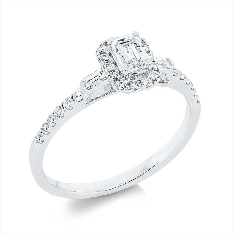 Ring 18 kt WG. 2 Baguette 0.07 ct. TW-si. 1 Sm.schliff 0.32 ct. TW-si. 26 Brillanten 0.21 ct. TW-si. Weite:53