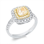 Ring 18 kt WG+GG. 30 Brillanten 0.62 ct. TW-si. 1 Cushion 1.28 ct. gelb. 20 Brillanten 0.15 ct. gelb. Weite:54