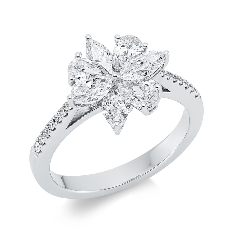 Ring 18 kt WG. 3 Tropfen 0.63 ct. TW-si. 4 Navette 0.80 ct. TW-si. 14 Brillanten 0.09 ct. TW-si. Weite:53