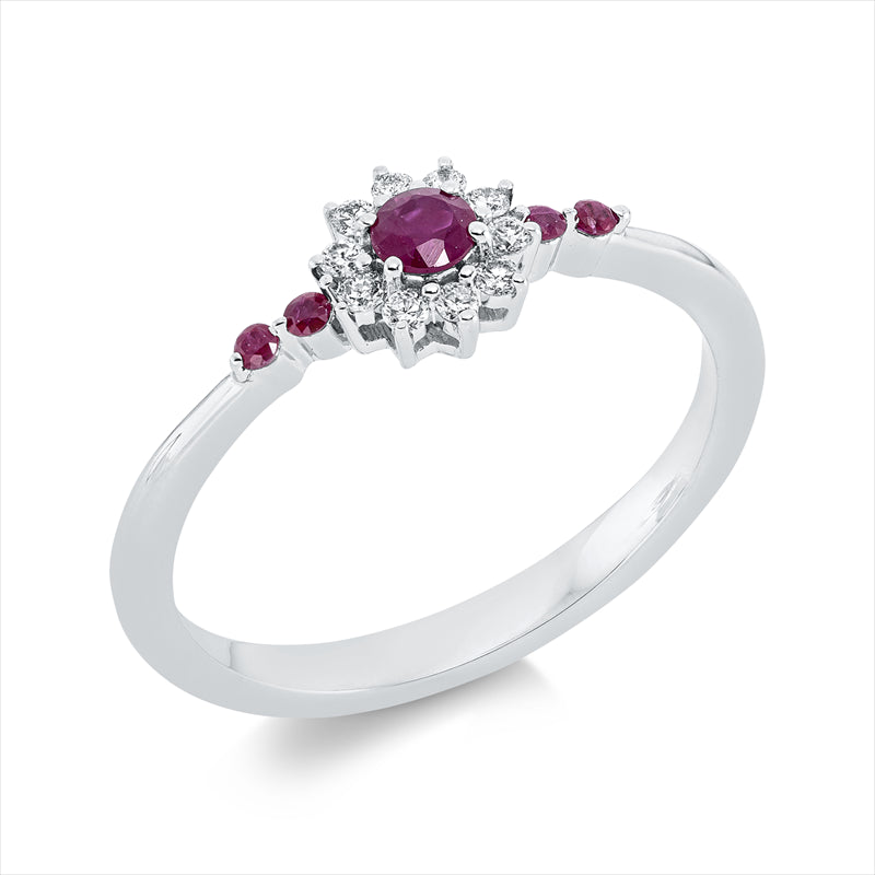 Ring 18 kt WG, 10 Brill. 0,09 ct, TW-si, 1 Rubin 0,11 ct rot, 4 Rubine 0,06 ct rot