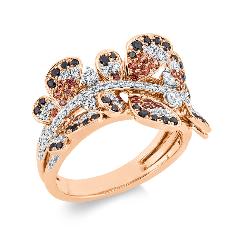 Ring 18 kt RG. Fassung rhodiniert. 63 Brillanten 0.47 ct. TW-vsi. 38 Brillanten 0.24 ct. schwarz. 36 Saphire 0.34 ct orange. Weite:53
