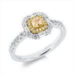 Ring 18 kt WG+GG, 4 Bag. 0,14 ct,20 Brill. 0,43 ct, TW-si, 1 Cushion 0,29 ct, gelb, 16 Brill. 0,05 ct, gelb