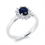 Ring 18 kt WG, 12 Brill. 0,30 ct, TW-si, 1 Saphir 0,91 ct blau