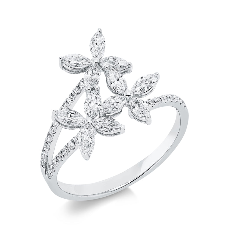 Ring 18 kt WG. 12 Navette 0.62 ct. TW-vsi. 26 Brillanten 0.13 ct. TW-si. Weite:53