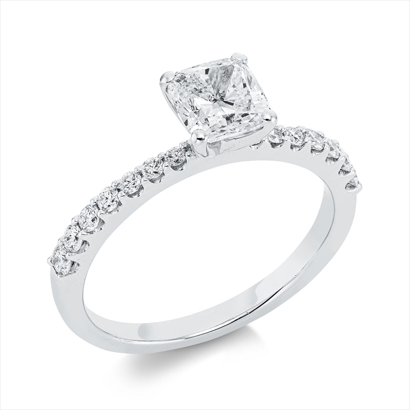Ring 18 kt WG, 1 Cushion 1,02 ct, TW-si, 14 Brill. 0,27 ct, TW-si