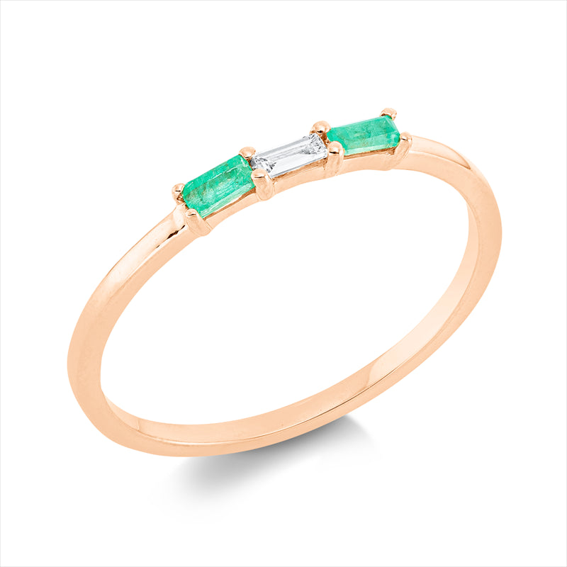 Ring 18 kt RG, 1 Bag. 0,05 ct, TW-vsi, 2 Smaragde 0,09 ct grün