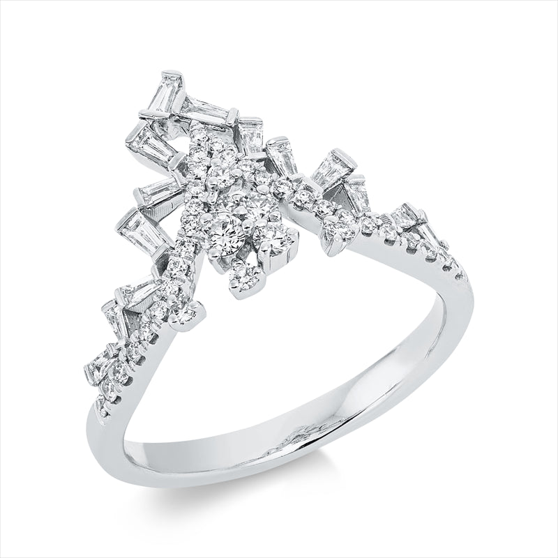 Ring 18 kt WG. 1 Brill. 0.05 ct. TW-si. 14 Trapeze 0.22 ct. TW-si. 36 Brillanten 0.27 ct. TW-si. Weite:54