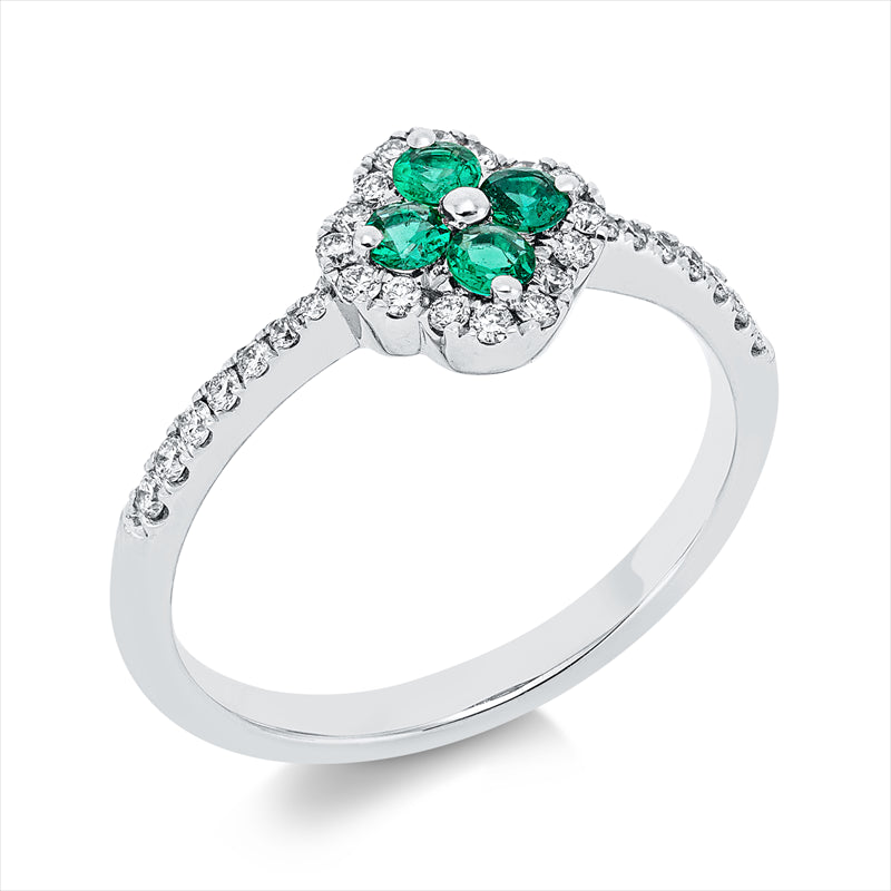 Ring 14 kt WG, 30 Brill. 0,23 ct, TW-si, 4 Smaragde 0,18 ct grün