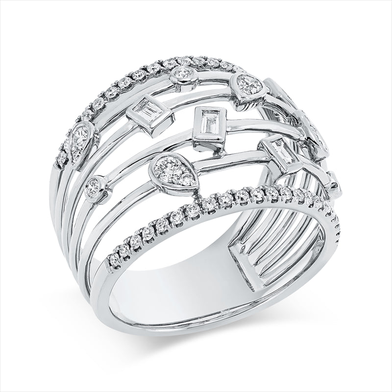 Ring 18 kt WG. 4 Brillanten 0.07 ct. TW-si. 4 Brillanten 0.21 ct. TW-si. 4 Baguette 0.16 ct. F-vsi/si. 46 Brillanten 0.29 ct. TW-si. Weite:54