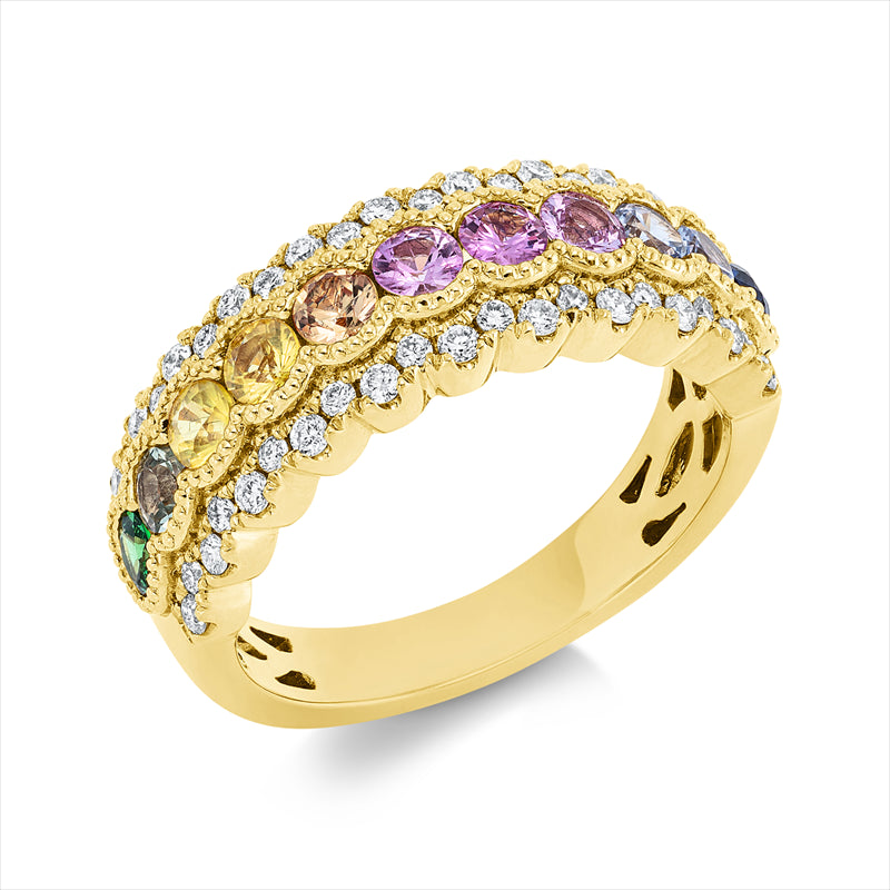 Ring 18 kt GG. 42 Brillanten 0.39 ct. F-vsi/si. 9 Saphire 1.32 ct multicolor. B:7.6 mm. Weite:54