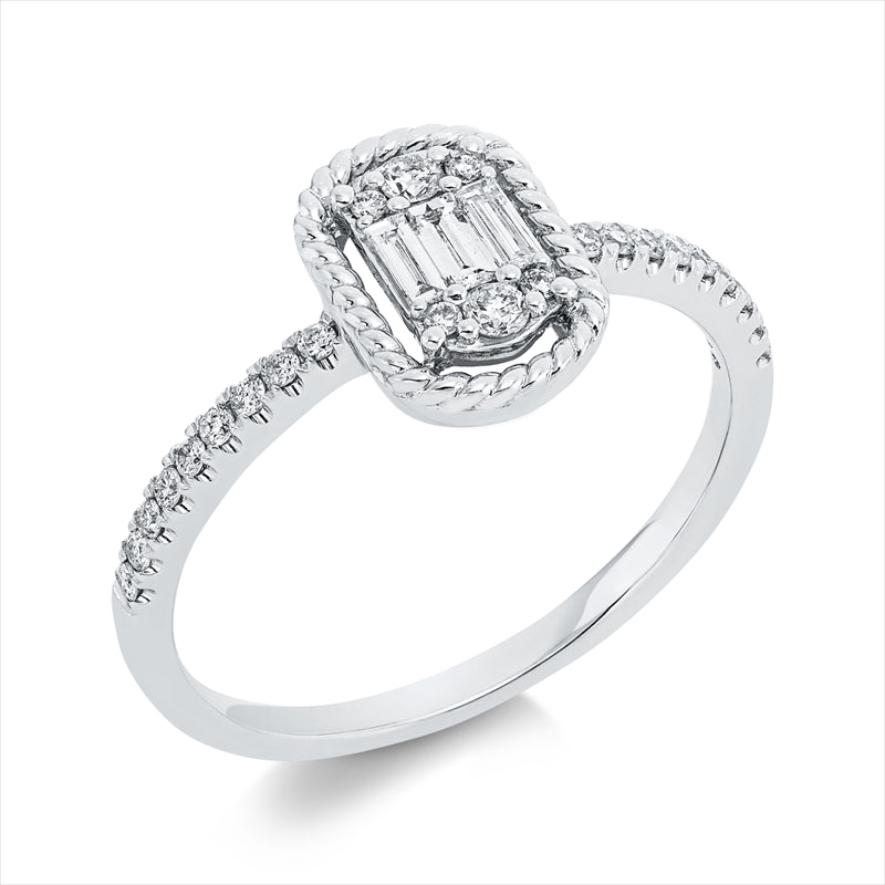 Ring 14 kt WG, 2 Brill. 0,05 ct, TW-pi, 3 Bag. 0,10 ct, F-vsi/si, 22 Brill. 0,13 ct, TW-pi