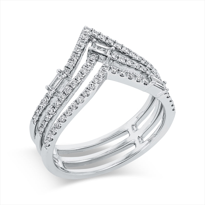 Ring 18 kt WG. 3 Baguette 0.09 ct. F-vsi/si. 71 Brillanten 0.41 ct. TW-si. Weite:54