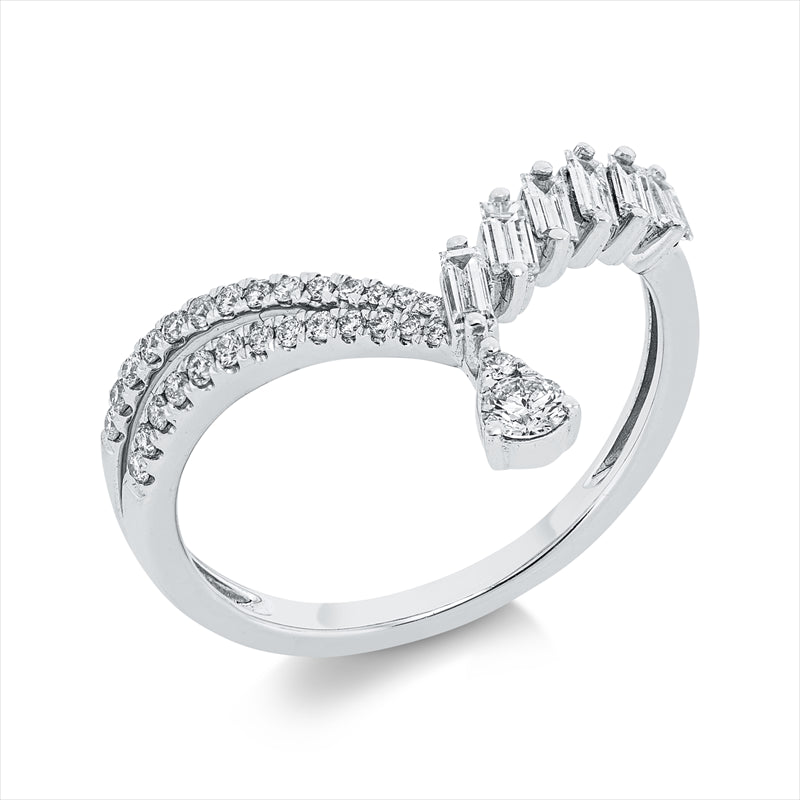 Ring 18 kt WG. 1 Brill. 0.07 ct. TW-si. 6 Baguette 0.30 ct. F-vsi/si. 28 Brillanten 0.16 ct. TW-si. Weite:54