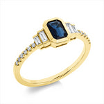 Ring 18 kt GG. 4 Baguette 0.11 ct. F-vsi. 12 Brillanten 0.10 ct. F-vsi. 1 Saphir 0.50 ct blau. Weite:54