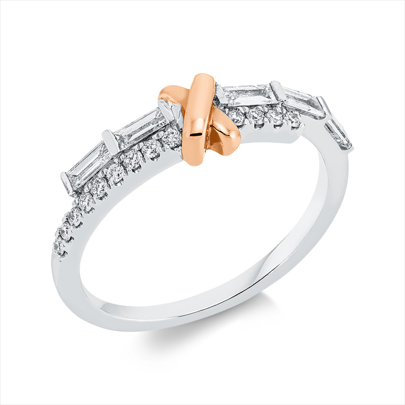 Ring 18 kt WG+RG, 5 Bag. 0,32 ct, F-vsi, 13 Brill. 0,11 ct, TW-si