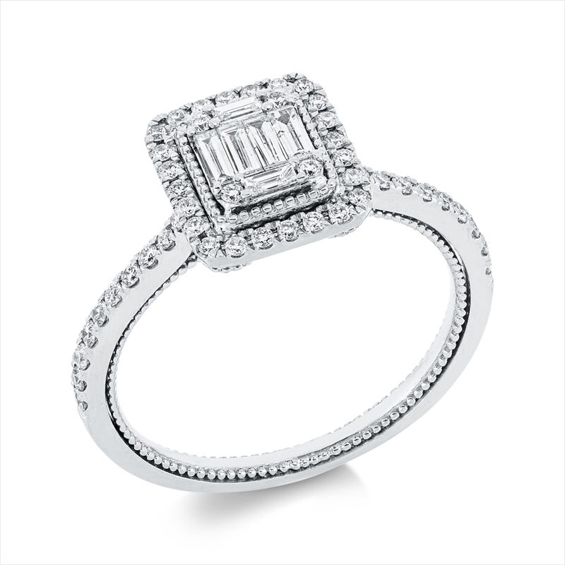 Ring 18 kt WG. 8 Brillanten 0.08 ct. TW-si. 6 Baguette 0.27 ct. F-vsi. 40 Brillanten 0.27 ct. TW-si. Weite:54