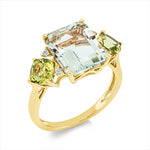 Ring 18 kt GG. 4 Brillanten 0.06 ct. TW-si. 2 Peridot 1.50 ct grün. 1 Amethyst 4.50 ct grün. Weite:53