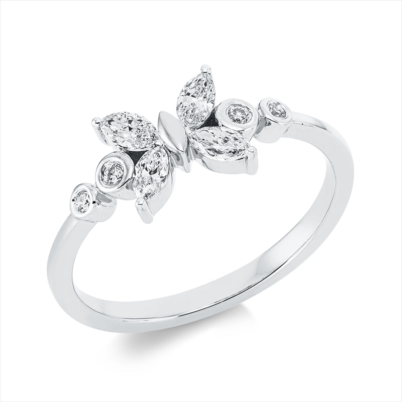 Ring 18 kt WG Schmetterling. 4 Navette 0.34 ct. TW-si. 4 Brillanten 0.05 ct. TW-si. H:12.3 mm. B:7.0 mm. Weite:54