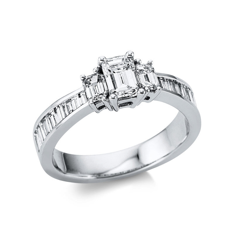 Ring 18 kt WG. 2 Sm.schliff 0.33 ct. TW-vsi. 1 Sm.schliff 0.52 ct. TW-vsi. 16 Baguette 0.65 ct. TW-vsi. B:3.8 mm. Weite:54