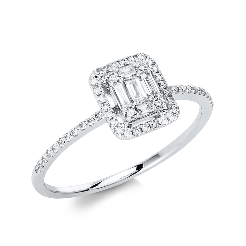 Ring 18 kt WG. 5 Baguette 0.13 ct. TW-si. 52 Brillanten 0.16 ct. TW-si. H:8.0 mm. B:7.0 mm. Weite:54
