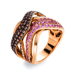 Ring 18 kt RG. 25 Brillanten 0.10 ct. TW-si. 67 Brillanten 0.91 ct. braun. 56 Saphire 0.88 ct pink. B:15.5 mm. Weite:54