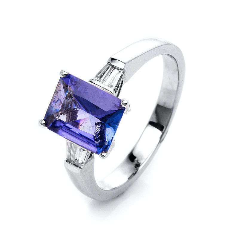 Ring 18 kt WG, 4 Trap. 0,14 ct, TW-si, 1 Tansanit 2,08 ct blau