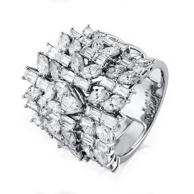 Ring 18 kt WG. 1 Princ. 0.18 ct. TW-si. 35 Navette 3.45 ct. TW-si. 32 Baguette 2.42 ct. TW-si. 1 Tropfen 0.07 ct. TW-si. Weite:55