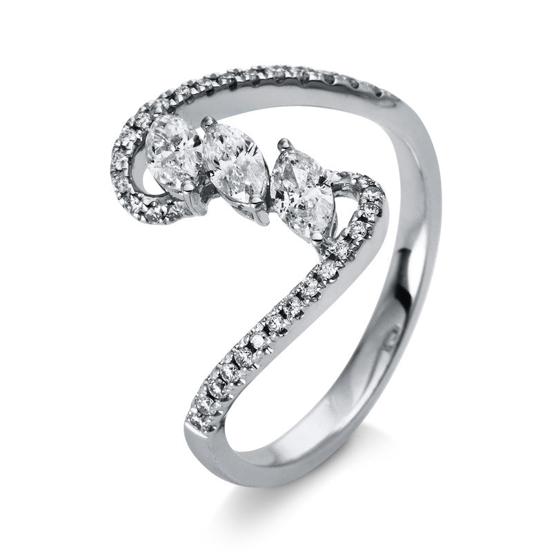 Ring 18 kt WG. 3 Navette 0.56 ct. TW-si. 34 Brillanten 0.15 ct. TW-si. H:8.0 mm. B:14.7 mm. S:2.2 mm. Weite:54