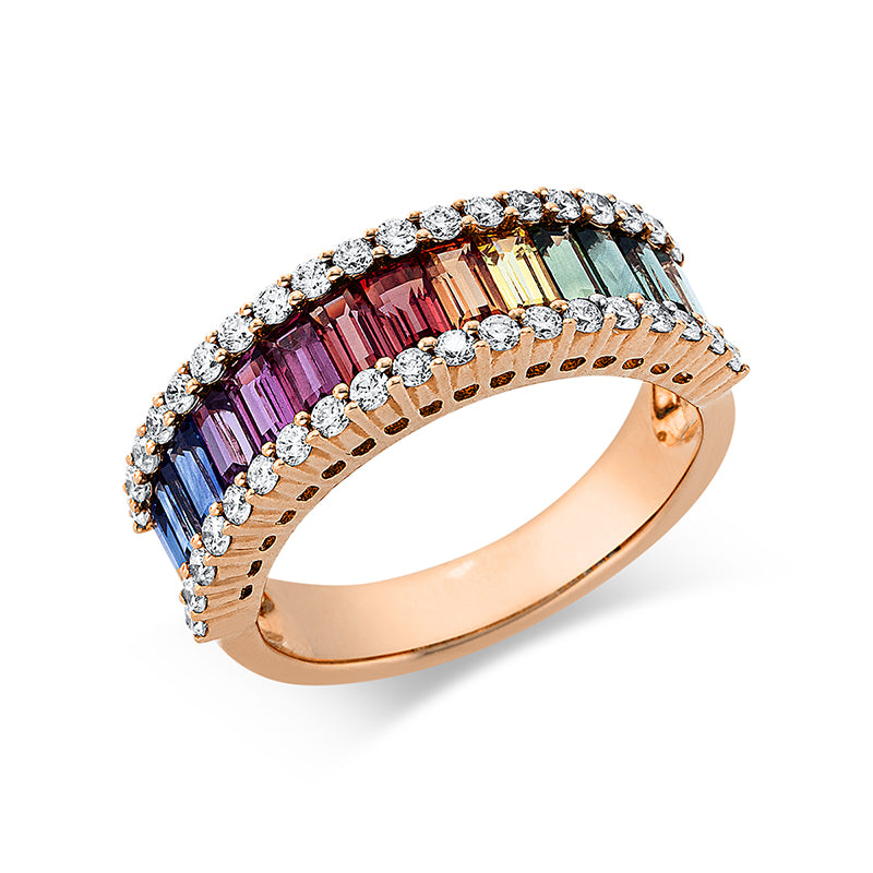 Ring 18 kt RG. 38 Brillanten 0.47 ct. TW-si. 14 Saphire 1.91 ct fancy. B:6.5 mm. Weite:54