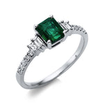Ring 14 kt WG, 4 Bag. 0,18 ct, TW-si, 10 Brill. 0,14 ct, TW-si, 1 Smaragd 0,90 ct grün