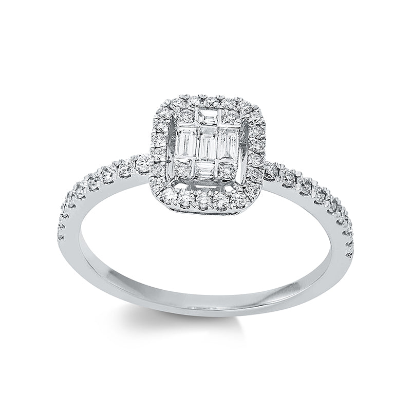 Ring 18 kt WG. 5 Baguette 0.12 ct. TW-si. 44 Brillanten 0.31 ct. TW-si. Weite:54