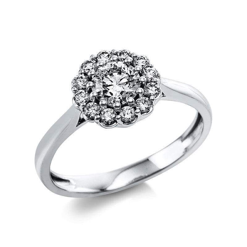 Ring 14 kt WG. 1 Brill. 0.50 ct. TW-si. 12 Brillanten 0.28 ct. TW-si. Weite:54