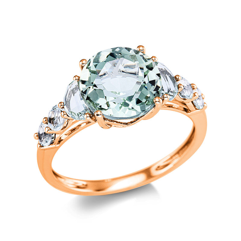 Ring 18 kt RG, 2 Amethyste 0,50 ct grün, 1 Amethyst 3,00 ct grün, 4 Amethyste 0,40 ct grün