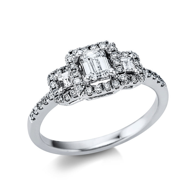 Ring 18 kt WG. 2 Baguette 0.11 ct. TW-si. 44 Brillanten 0.29 ct. TW-si. 1 Sm.schliff 0.34 ct. TW-si. Weite:54